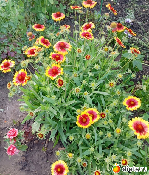 Цветущий июнь:гайлардия, рядом с ней бальзамин садовый, остеоспермум, розы, дельфиниум. Дельфиниум очень удачный, выше меня ростом