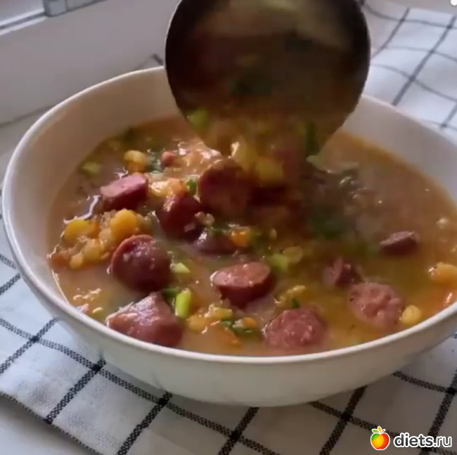 Сначала нужно потереть морковь на крупной терке и мелко нарезать лук, затем обжарить их до золотистого цвета. К ним добавляем нарезанные копчености и продолжаем жарить для аромата. Горох нужно варить отдельно до тех пор, пока он не станет мягким, после чего к нему добавляются обжаренные овощи с копчеными продуктами, соль и перец по вкусу. Варить все вместе, пока горох не размягчится и не сделает бульон густым. В конце посыпать нарезанной петрушкой.