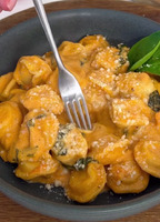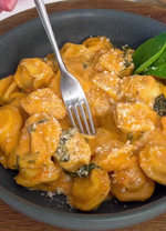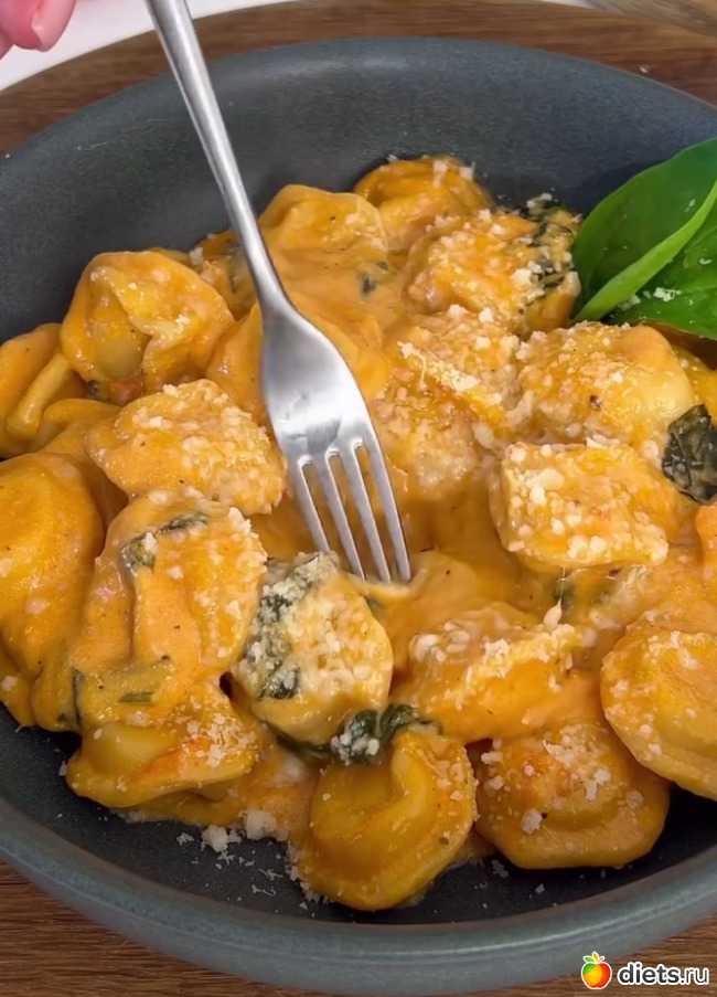 Помидоры нарезаем и тушим с чесноком до мягкости под крышкой (минут 7-10), затем добавляем томатную пасту, стакан воды (200 мл) и измельчаем погружным блендером до однородности. Затем вливаем сливки, соль со специями и шпинат, перемешиваем и всыпаем пельмени, перемешиваем и тушим по крышкой на среднем огне 20 мин. Подаем с пармезаном, это ооочень вкусно.