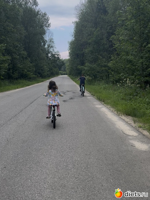 Из моих занятий у меня вынужденно в жизнь вошел бег. Настя поехала на двухколесном велосипеде и нужно подстраховывать, так как ездит по асфальту, а это дорога по- которой машины проезжают. 2 км туда, 2 обратно, отгоняя от себя и от нее слепней. А бегала я в супер экипировке - юбка, сандали.