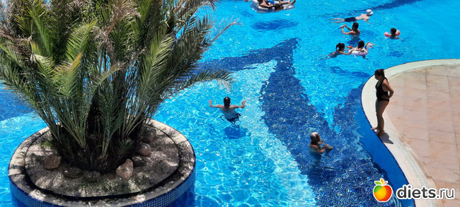 На бассейне днём играла классная музыка, кто хотел, тот танцевал...проходили игры, аквааэробика и разные спортивные мероприятия. Правда, всё одно и то же. Как под копирку. Это уже критика от пионервожатой))) Мой играл в водный воллейбол, а вот в ватерполо чёт так и не собрался. Там играли эти афро и ему было стыдно даже рядом постоять (наверное)))) Вместо нахаживания шагов, он наплавывал мили, делал аква-упры))) я тоже много плавала. И вообще, я умудрялась там нахаживать туеву кучу шагов!!! Где только?! )))