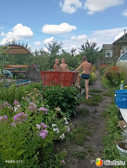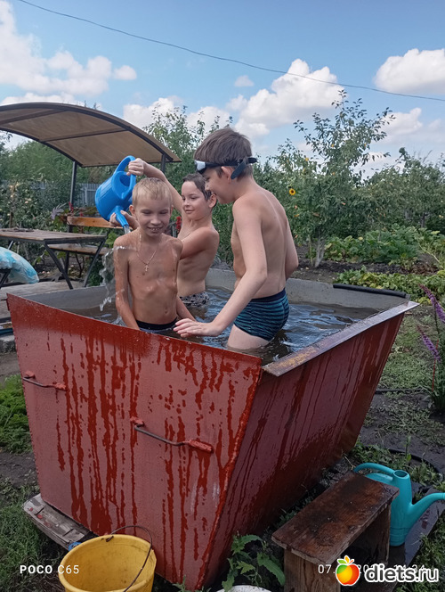 Ребятня залезла в ёмкость для воды, использовав ее как бассейн. Довольные донельзя. Придумал, конечно, Гриша. Дед снял крышку, мальчишки веселились, брызгались, поливали себя из лейки. Теперь обязательно подрастут