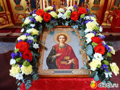 Имя святого великомученика Пантелеимона призывается при совершении Таинства Елеосвящения, освящения воды и молитве о немощном.