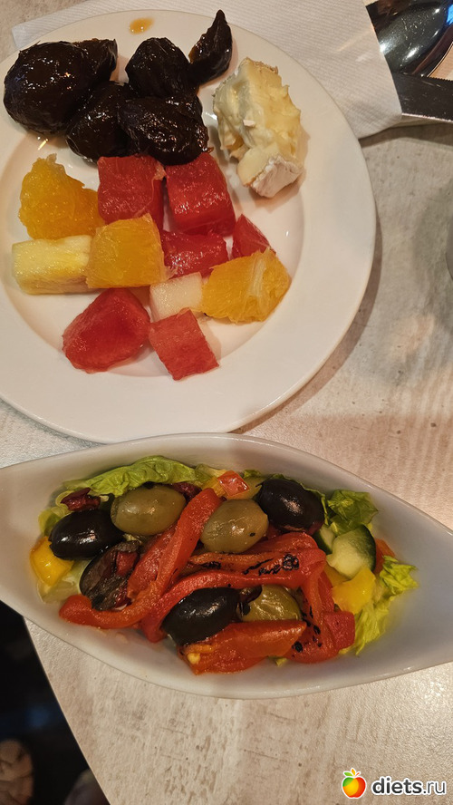 Вчера я писала, что совсем нет овощей, сегодня они исправились, вынесли салат, но ровно две порционные плошки