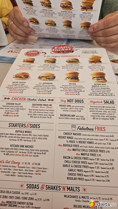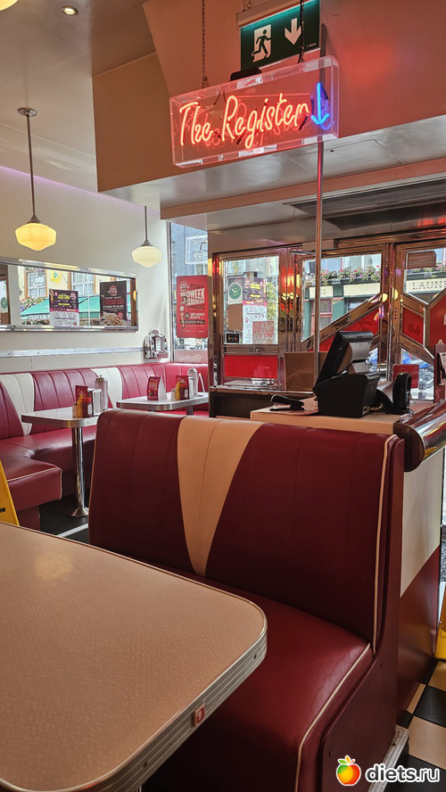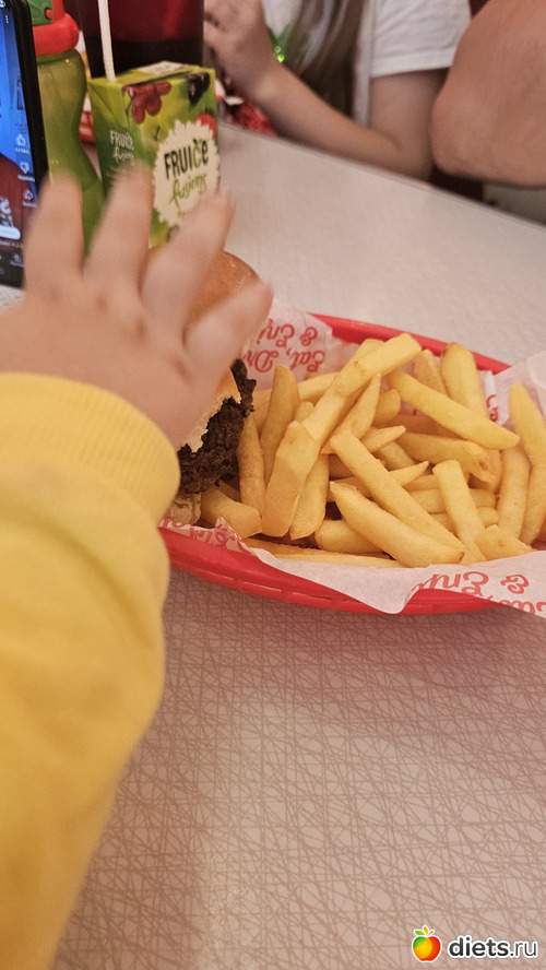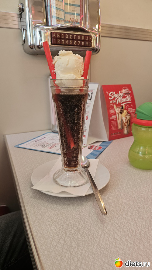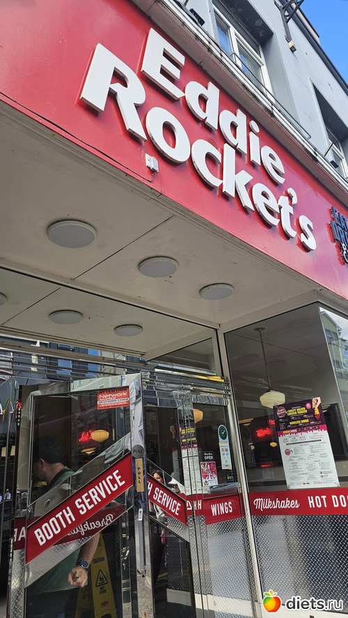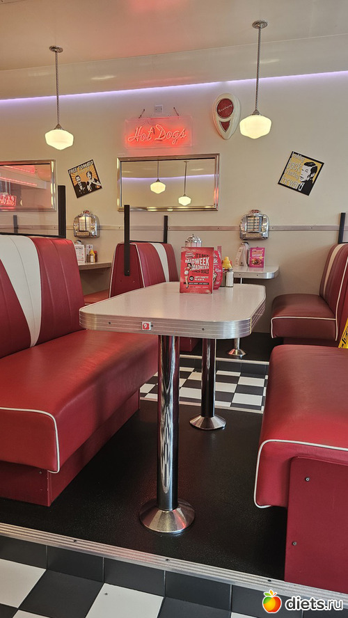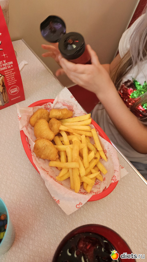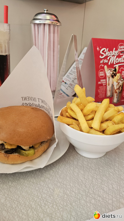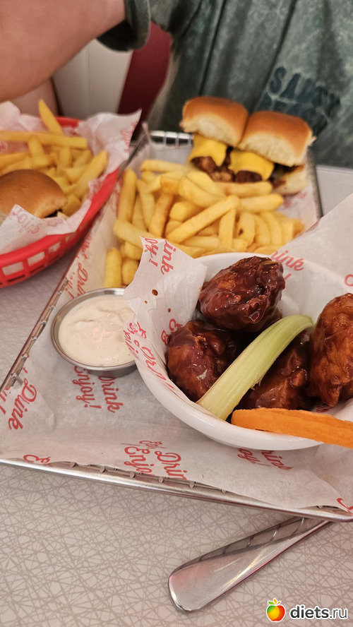 Ужинали сегодня в забегаловке из списка сына - Eddy Rocket’s. Американская сетевая закусочная в стиле 50-х годов. Я себе ничего не заказывала, из порции мужа попробовала курицу в панировке. Мои в восторге, как от любой бургерной