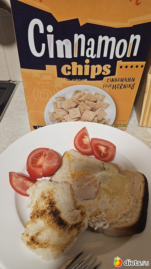 Завтрак. Хлопья с молоком, кому не хватило молока (литра на семью на раз уже не хватает!), тому яйца в батоне