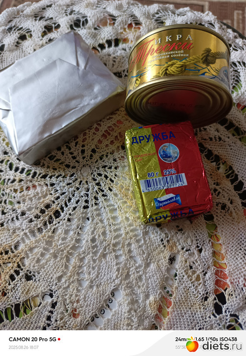 Икра (красная, черная или дешевая-минтая, трески и т.д.) — 130-140 г(1 баночка)