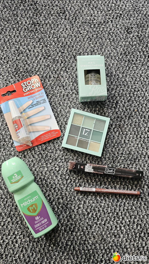 Покупки (лак для грызущих ногти - дочке, укрепитель для ногтей, палетка, карандаши для век и губ, дезодорант)