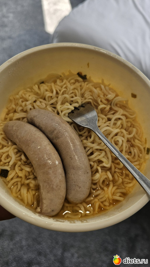 Ужин от мужа: сосиски и рисовые рамены (прилетевшие с нами из Литвы)