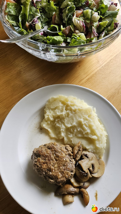 Говяжьи котлеты с пюре и салатом. Тут дешевая говядина, муж кайфует