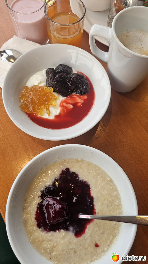 Каша с компотом; йогурт, чернослив, варенья; клубничный смузи, шот предположительно из айвы с имбирем