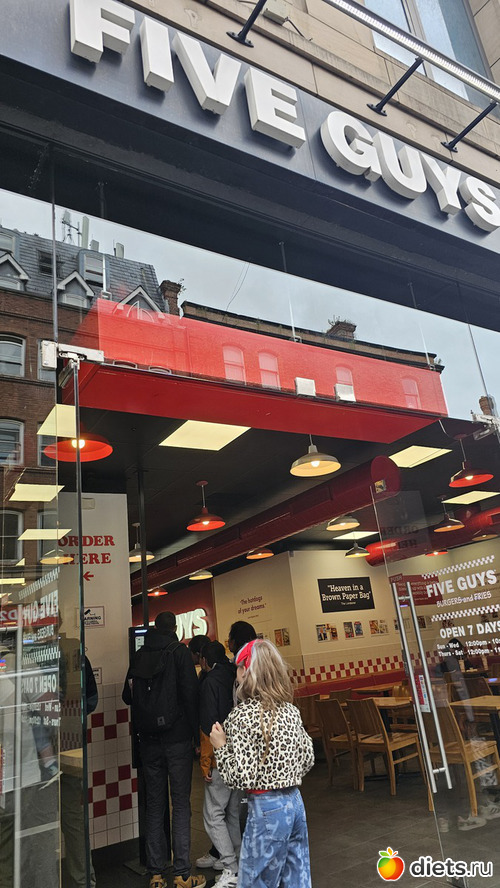 Вторая точка - бургерная Five guys. У нас нет этой сети, за границей были дважды. Это любимая бургерная сына. Уже одно то, что там 25 сортов лимонадов, и все можно пополнять сколько угодно раз, большой плюс для него