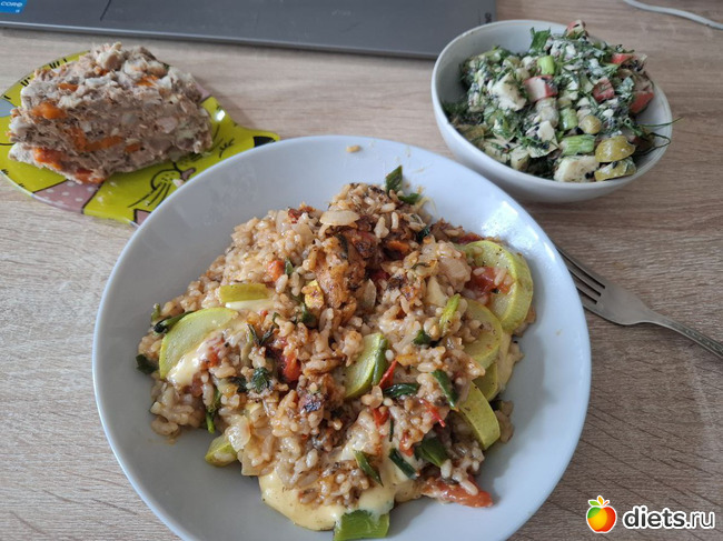 Рис обжаренный с колбасой и кабачками, ветчина - Петя делал в ветчиннице из рульки, говядины, морковки и желатина