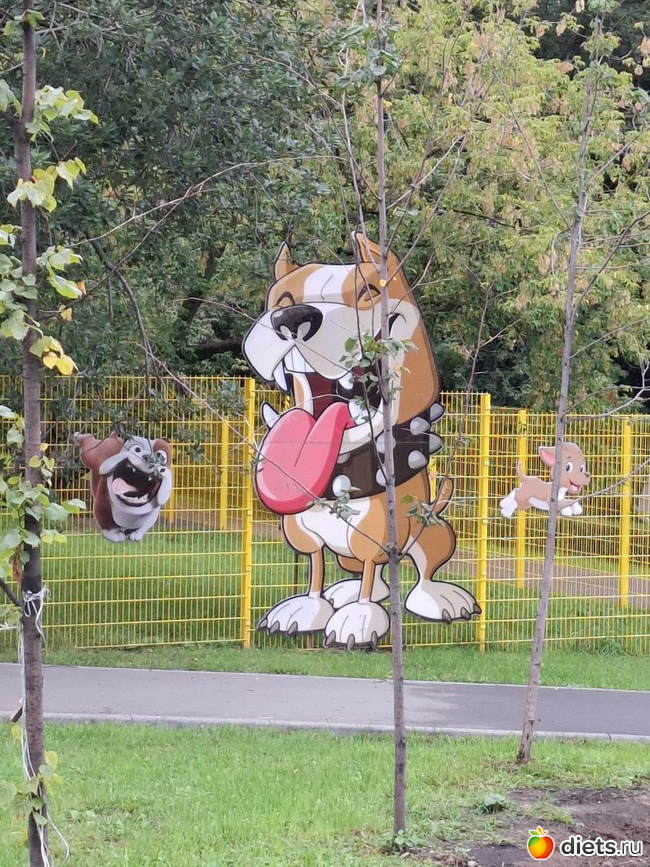 А чуть дальше - собачья площадка, со всякими там горками, огороженная, яркая