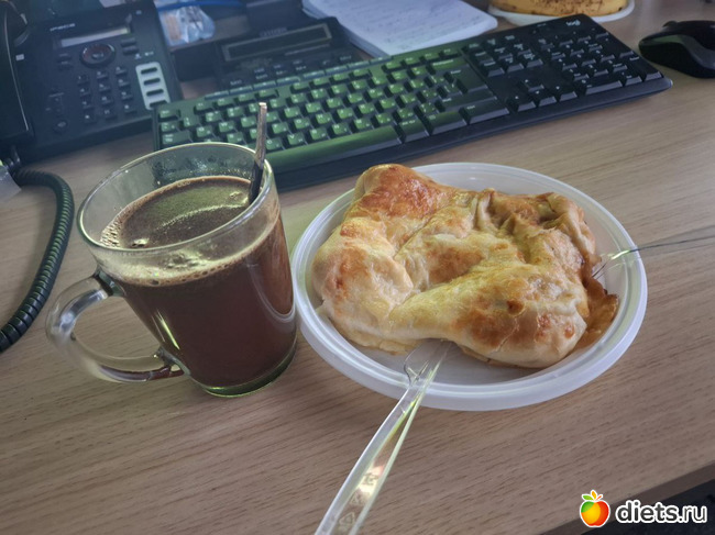 И - завтрак - дома не ела, собирала и мужа, и себя, он сейчас с термосом и ланч-боксом ходит, с вечера не положишь, не продержится тепло. Утром грею - и тогда уж отдаю