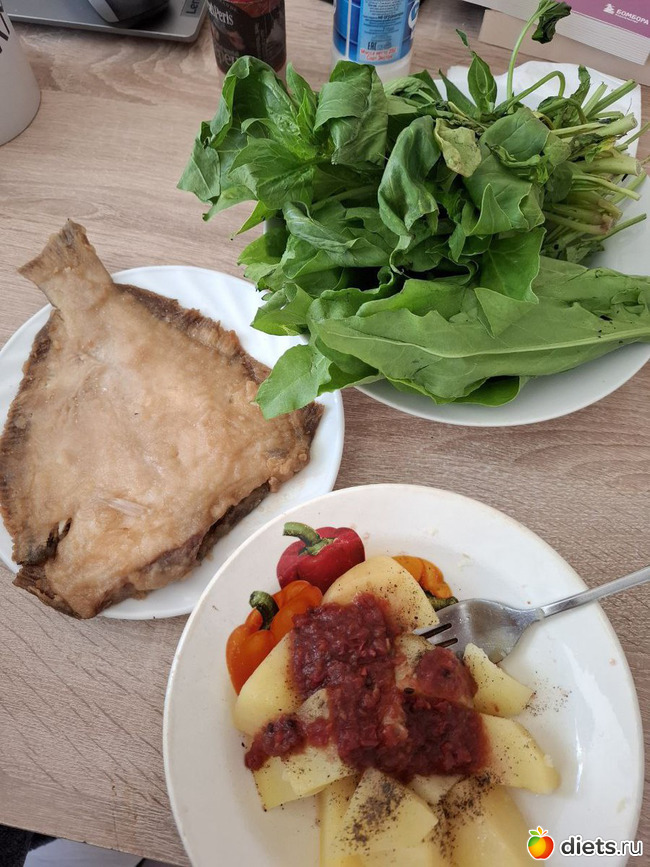 Камбала жареная, щавель и шпинат, картошка отварная с домашней аджикой