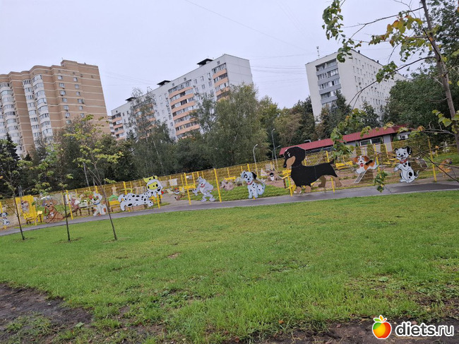 А чуть дальше - собачья площадка, со всякими там горками, огороженная, яркая