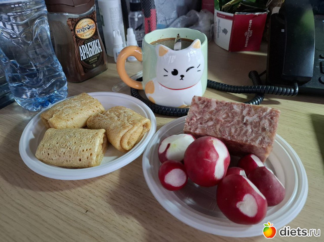 Блинчики с творогом, редис, мясо свиных голов, кофе из котовой кружки