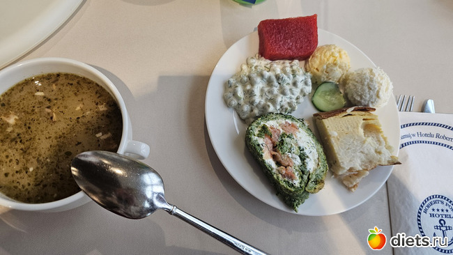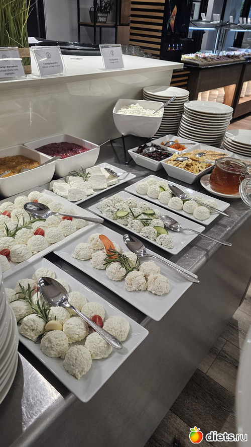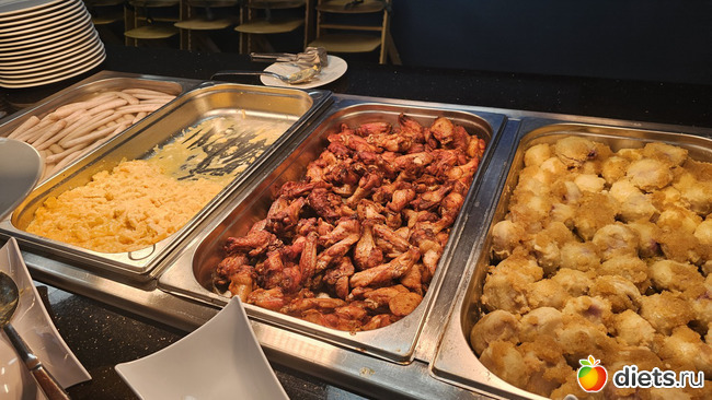 Фотографировать все "прилавки" было неудобно, поэтому короткое резюме: выбор отличный, суп, вторые горячие блюда, например, жареная курочка, множество холодных закусок, много вариантов из рыбы и творога, к сожалению, не было каши