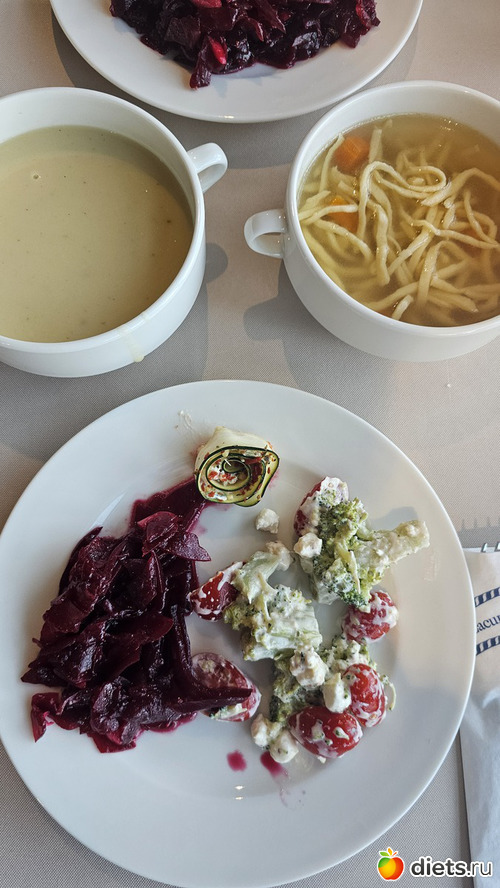 Суп-пюре овощной и бульон из индейки с макаронами, салат из свеклы с луком, рулет из цуккини с сыром, вкуснейший салат из брокколи, повторила три раза его! Кто бы мог подумать, я вообще не ем салаты