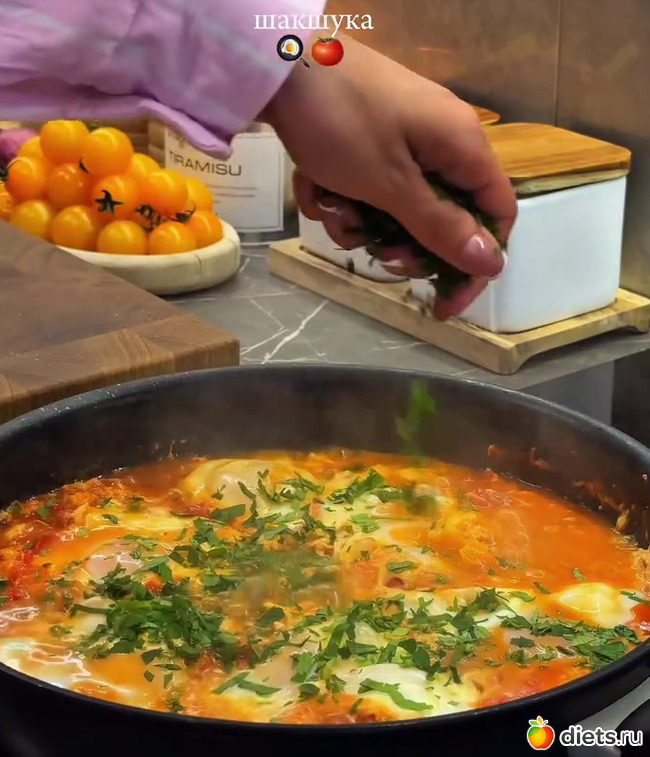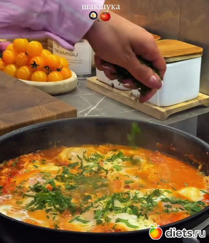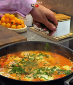 На оливковом и сливочном масле обжарить до мягкости красный лук, затем добавить мелко нарезанный сладкий перец ( у меня Рамиро), затем мелко нарезанные помидоры и томаты в собственном соку ( или 2 ч ложки томатной пасты), добавить специи, острый перец чили, соль и обязательно сахар, чтобы убрать кислотность, тушить под крышкой минут 10, затем сверху