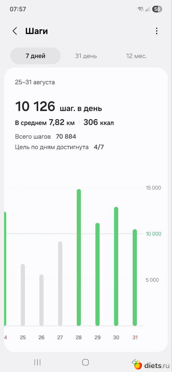 Порадовала прошлая неделя – среднее количество шагов всё-таки достигло 10 тыс!!!