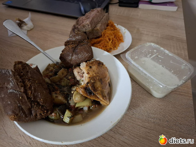 Рагу, 1/2 куриного бедра жареного, корейская морковка, печёночный хлеб, багет ржаной чесночный
