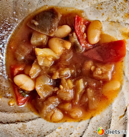 Добавить красный перец, томатную пасту, соль, сахар, фасоль с небольшим количеством отвара (можно без отвара, если любите погуще), тушить 10 минут.