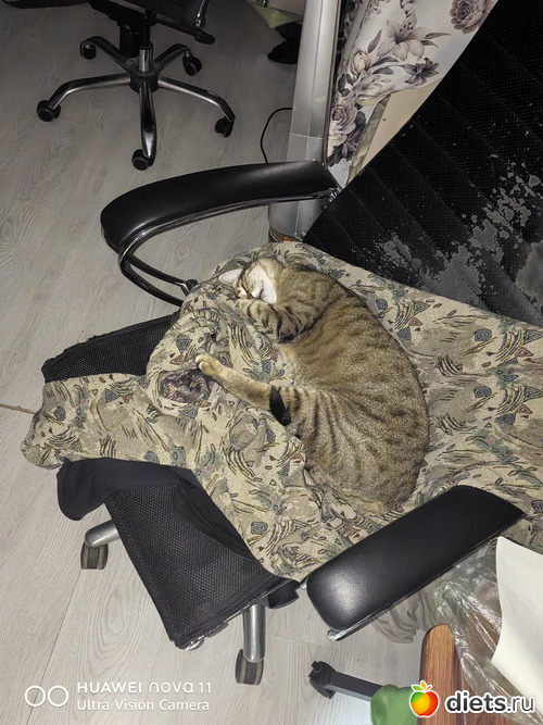 Теперь вот притащил домой. Якобы для моего переезда у него места в машине не было, ага. Я-то думала хотя бы обратно в машину унесет и пусть с ним дальше катается. Ну или продать на Авито. Но... у котика на это кресло оказались свои планы