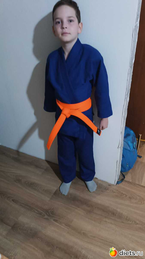 Гриша ходит на тренировки, пока общеспортивные (бег, растяжки, приседания- отжимания и т. п.), их тренер не то приболел, не то в отпуске. Вырос из старого кимано, купили новое