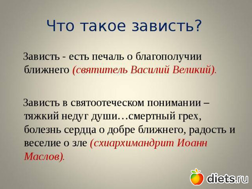 Святый Василий, в Поучении о зависти, между прочим говорит: «Зависть есть скорбь сердцу, тля души, сушило телу, разорение любви, ко всем вражда, отлучение роду, спона добродетели, залог мучению, лишение будущей жизни, геенне наследие».