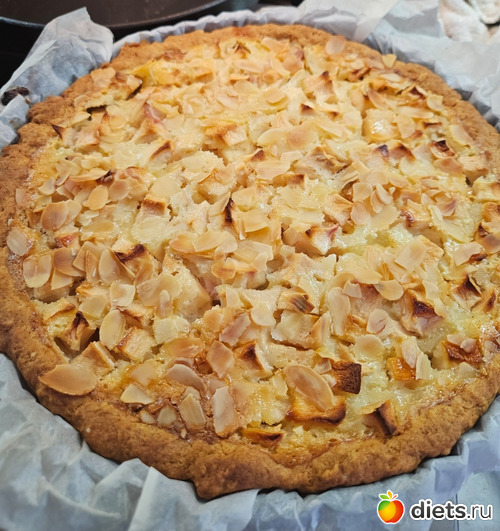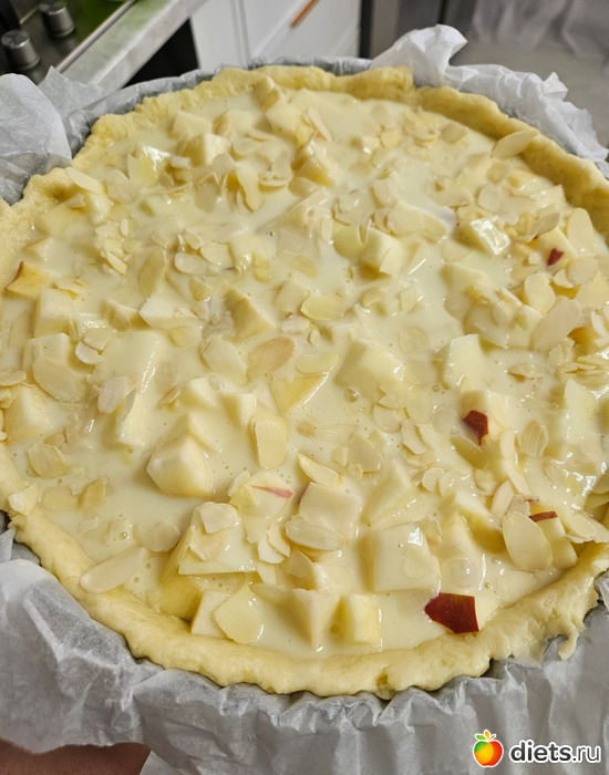 Охлажденное тесто выложить в форму (у меня 24 см), сделать бортики. Сверху выложить яблоки и залить заливкой.