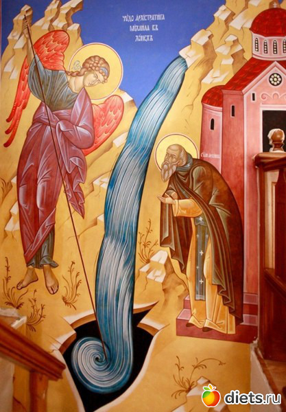 По его молитве около храма явился Архистратиг Михаил, который ударом своего жезла открыл в горе широкую расселину и повелел устремиться в нее водам бурлящего потока.