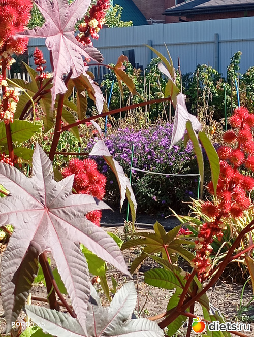 Гацания, гайлардия, георгины, клещевина, и вид из беседки.