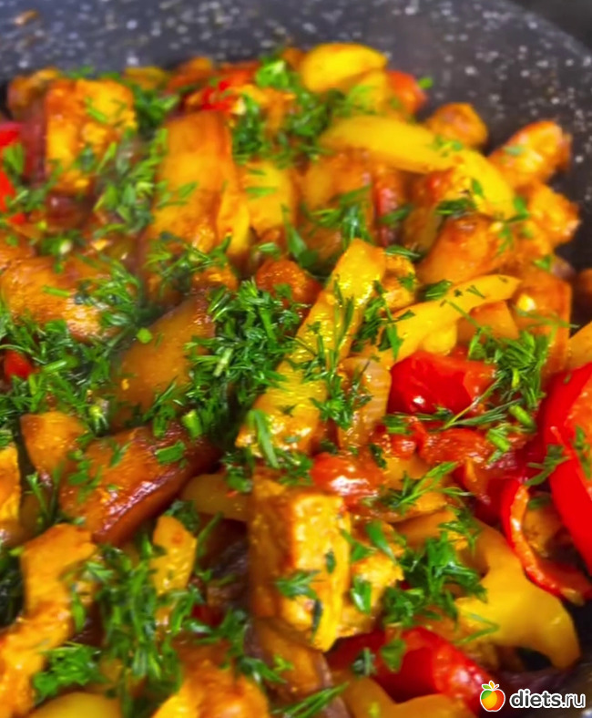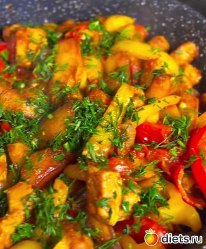 4. Накрываем крышкой и тушим буквально 3 минуты, перец должен остаться хрустящим, а помидор не превратиться в кашу.