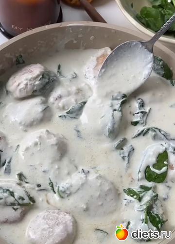 3. Подогреваем сковороду, растапливаем сливочное масло и кладем чеснок, перемешиваем, следом вливаем сливки и крошим сыр. Томим под крышкой минуту-две на слабом огне. Кладем шпинат и фрикадельки - держим под крышкой ещё пару минут до готовности. Если что можно чуть-чуть кипятка добавить, если видите, что соус густоват, либо же сами сливки.