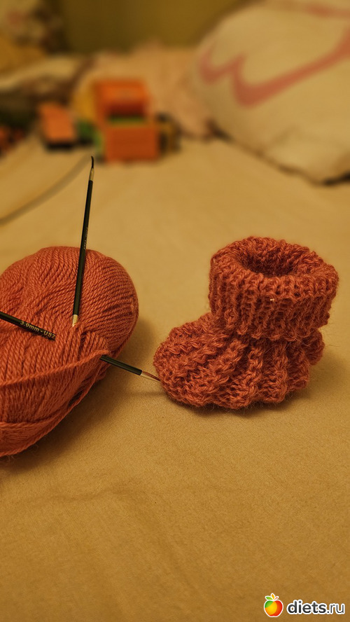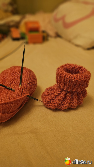 Но я о другом. Дочка подорвалась организовать прощальный подарок. Будет коробка со всякими мелочами, кто что из учеников придумал. От себя дочка хочет подарить пинетки ручной вязки, при том, что она не вяжет, много раз пыталась научить ее вязать, но руки кое у кого не из того места растут