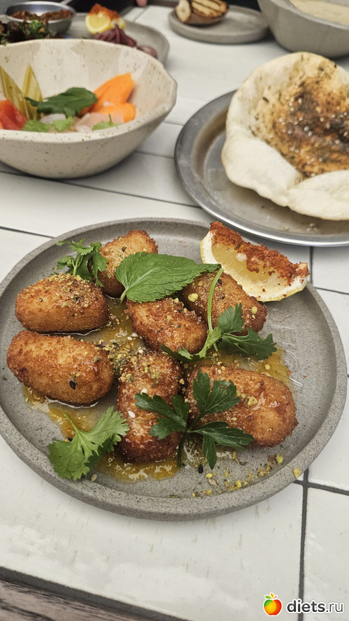 Мне - халуми с соусом из мандаринового варенья, меда и фисташек. Соус отличный, а халуми в панировке, которую я не очень переношу
