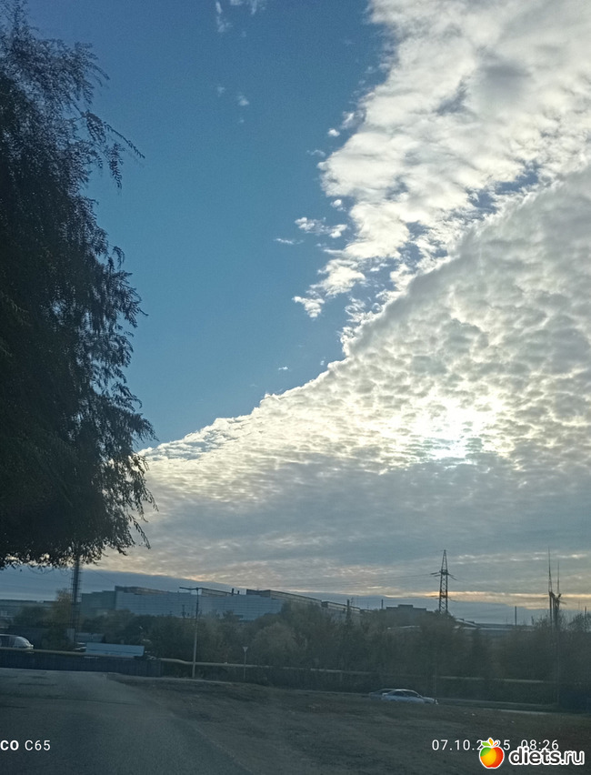 Сегодня несколько радостей жизни: очень красивое небо утром ( на фото), солнечный день, на работе мало народу - повязала, бассейн и синее небо с белыми красивыми облаками по дороге домой над волжскими далями. Как-нибудь в погожий день надо остановиться и с этой кручи сфотографировать Волгу.