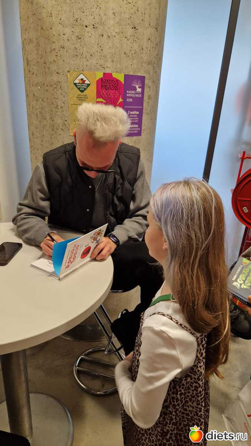 Муж возил дочку на книжную ярмарку. Впервые она устраивалась в Каунасе, до этого 25 лет проходила в Вильнюсе. На ярмарке была возможность встретиться с любимым детским писателем Томасом Диргелой, уже писала про него дважды, несколько лет назад возили сына на встречу, а в прошлом году - дочку