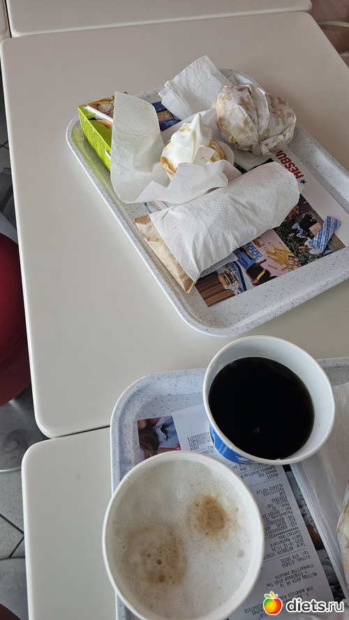 И закончили все дело в Хесбургере. Я нарушила свою диету, взяла кофе. Забыла из дома взять, пью я кофе по расписанию, уже на час опаздывала с дозой, головешка раскалывалась, так что заказала. Тыквенный латте. А дочка кучу всего нахапала, 2 разных бургера, картошку, колу, сок, мороженое...