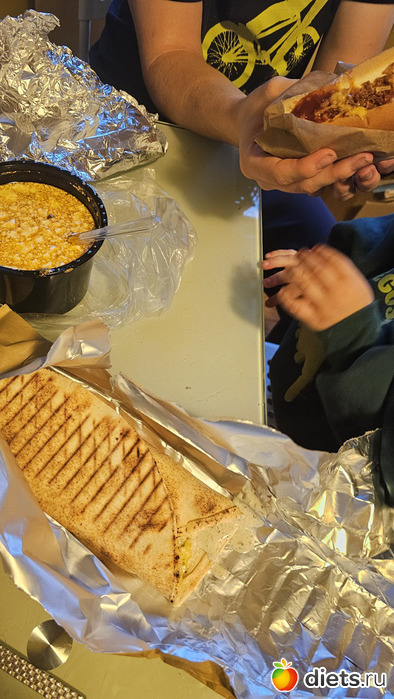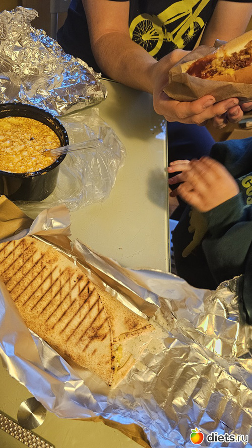 Муж повез дочку на вечеринку с пиццами в танцевальную студию. Старший сын предложил взять еды из шаурмичной на вынос. Выбирал и платил он, выбор так себе, на троих: суп рассольник, хот -дог и шаурма "Сырная бомба"