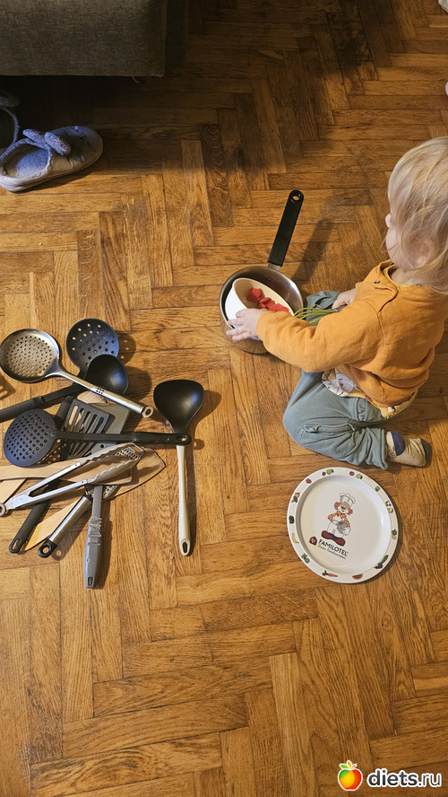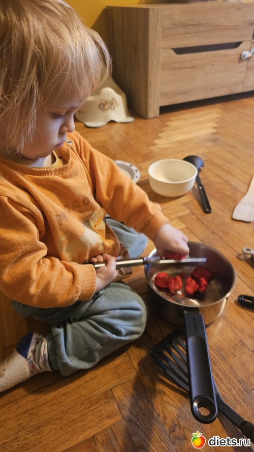 Утром играли. Больше всего ему нравится играть в готовку