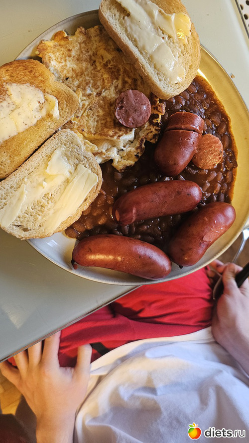 Завтрак сына: 4 сардельки, 3 бутера, банка фасоли, 2 яйца, еще и сладости к кофе на десерт