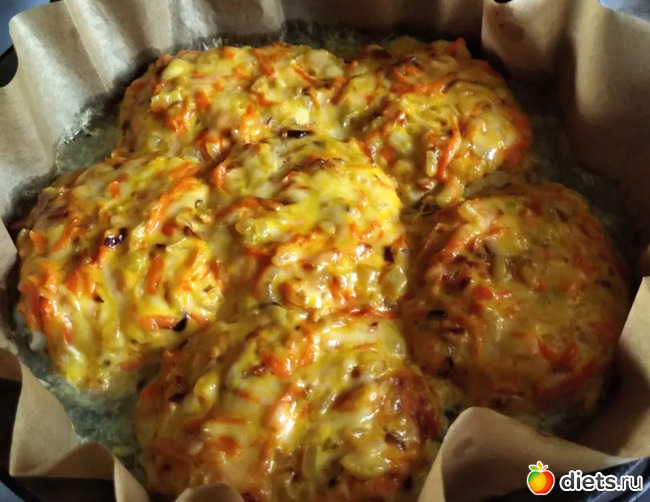 Смешать майонез, яйцо, крахмал, тертый сыр, лук с морковью - получается довольно густая смесь. Немного посолить т.к. майонез и сыр уже содержат соль.