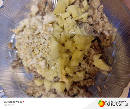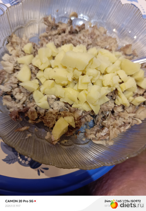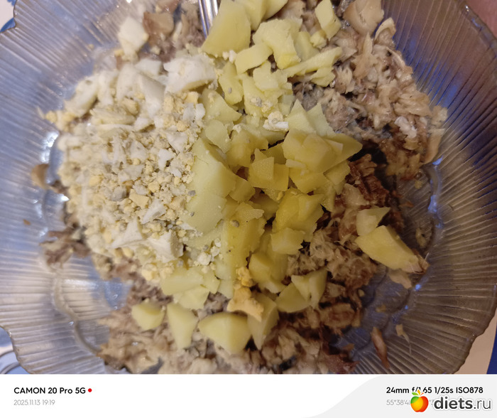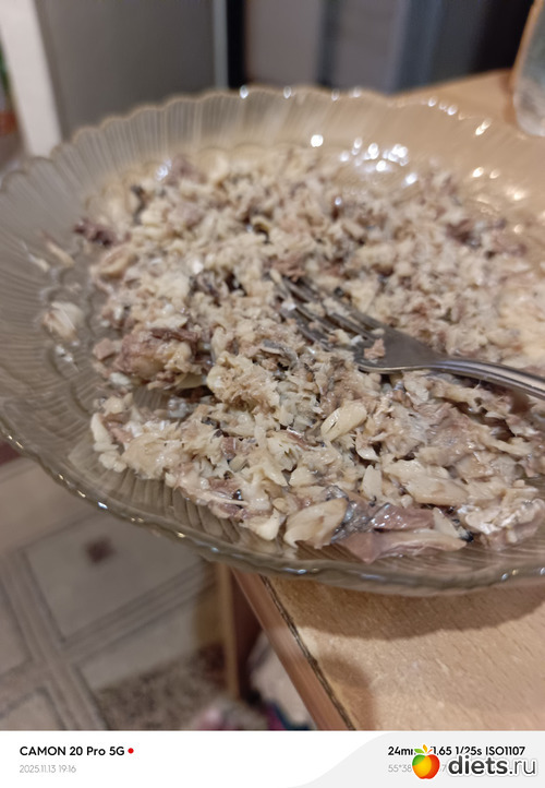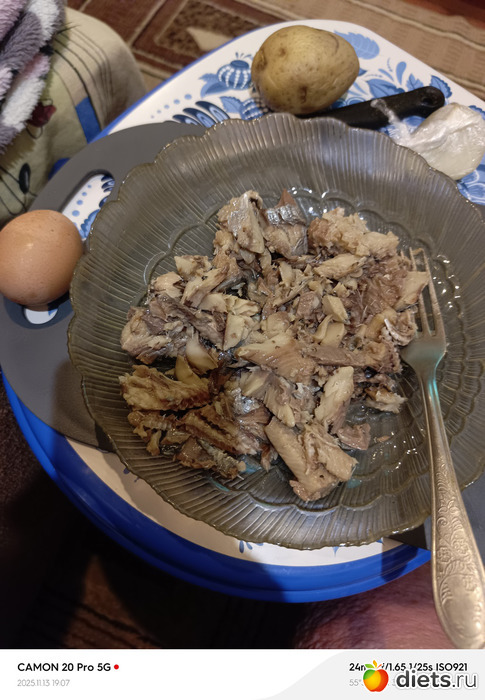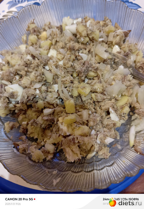 1 банка рыбных консервов (размять)+1-2 отваренных картофелины+лук мелко порезанный+1 яйцо вкрутую, порубленное.