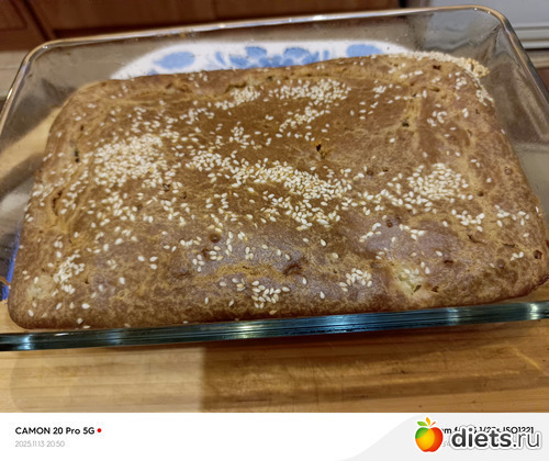 Половину теста перекладываем в смазанную форму, далее начинка, далее оставшееся тесто. Посыпаем -по желанию кунжутом и ставим в разогретую духовку. Выпекаем пирог при 180 градусах до готовности(проверяем готовность пирога прокалыванием- зубочисткой -до сухой зубочистки)