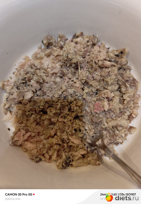 Освободить рыбные консервы от косточек (по желанию) и размять вилкой консервы
