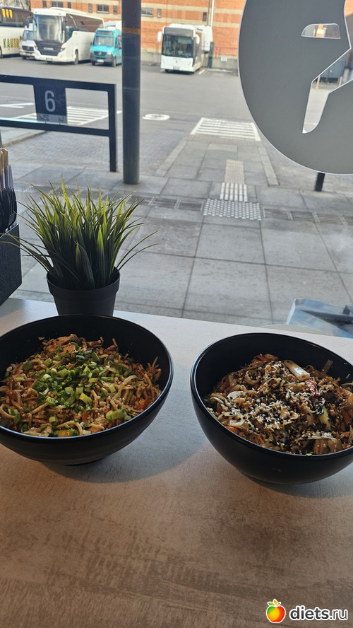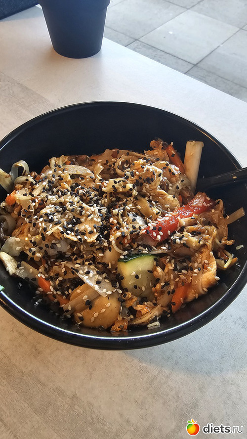 Наши вок макароны, тут можно выбрать мясо, сорт макарон и соус, а они на свое усмотрение добавляют 6 видов овощей. Вес порции 600 г, цена высокая для забегаловки, 13-15 евро. Но вкусно, слов нет