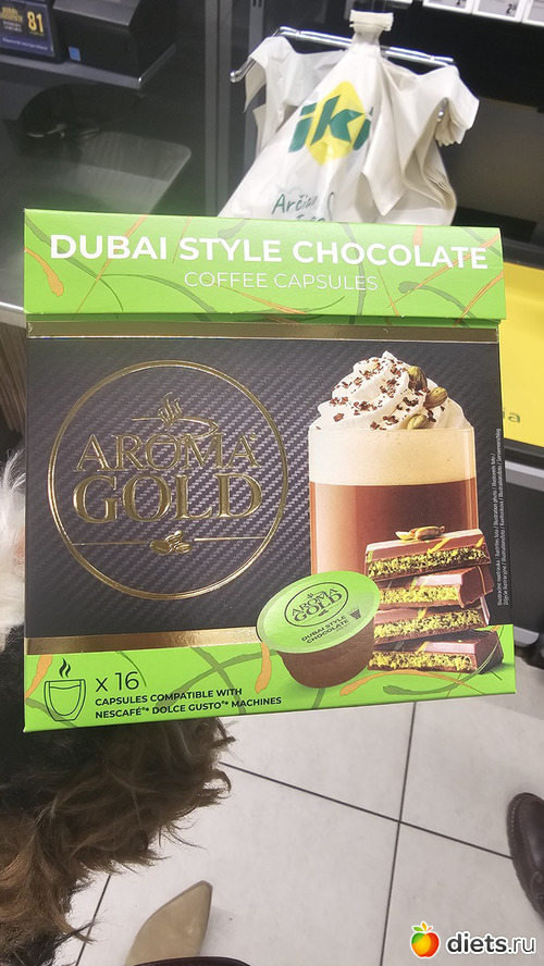 Ну и заехали в супермаркет у дома, к концу недели уже ничего не надо, кроме капсул, на которые была скидка, втечение недели пришлось обойти 6 супермаркетов этой сети, и вот только в 6-м нашли - капсулы со вкусом дубайского шоколада